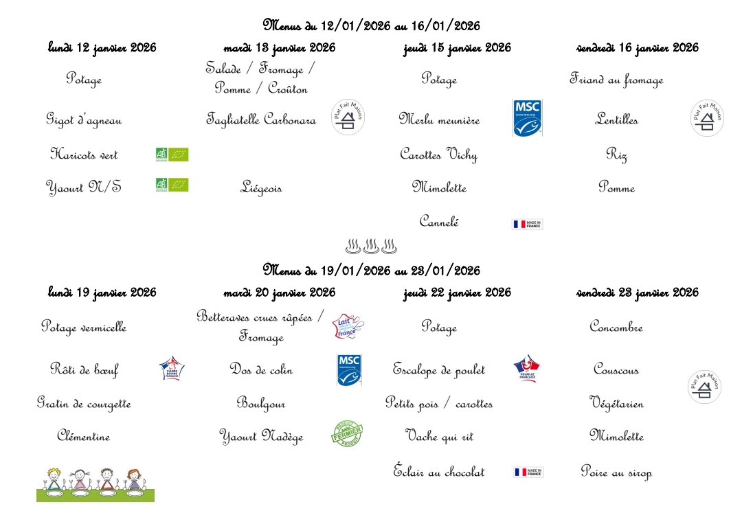 Le menu est adressé par mail aux familles chaque mois par la caisse des écoles.